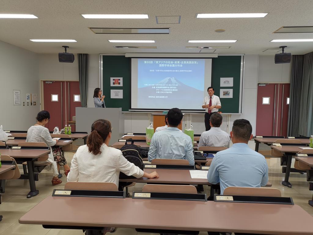 在日本经济大学期间,学院代表团首先参加了第55届东亚社会・产业・企业国际学术会议。本次国际学术会议由日本经济大学大学院政策科学研究所、亚东经济国际学会(第55回)、全球化区域研究会(第6回)、日本观光学会九州・冲绳支部、东北亚福祉经济共同体论坛、韩国・长善综合福祉共同体论坛、中国・复旦大学产业经济学系、中国・英国365集团公司、台湾・国立高雄科技大学管理学院联合举办,大会主题为“东亚社会・产业・企业发展政策”。会议共分为三个阶段,第一阶段研究报告,主要由日本经济大学院教授高桥文行、英国365集团公司孙爱淑博士和刘涛老师以及日本经济大学教授市川千寻等作为主讲人进行汇报。第二阶段基调演讲,主要开展了3个主题报告,报告主题分别为“东亚平和・社会发展”、“东亚产业・观光发展政策”、“东亚社会・福祉发展政策”,分别由名古屋大学名誉教授平川均、复旦大学教授芮明杰和国立高雄科技大学教授刘修祥等教授作为主讲人来开展汇报。第三阶段专题报告,我院龙海军副教授、彭耿教授、王泳兴博士、殷强博士以及我院研究生张晓丹和周宇分别做了主题发言,并在会议结束后与其他高校代表进行了深入的交流与讨论。